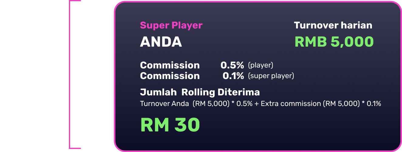 Rolling yang anda peroleh akan dikira sebagai pemain kerana jumlah pertaruhan adalah daripada permainan anda sendiri (0.5%). Anda juga akan memperoleh komisen tambahan sebagai 'super player' (0.1%) daripada jumlah pertaruhan anda.