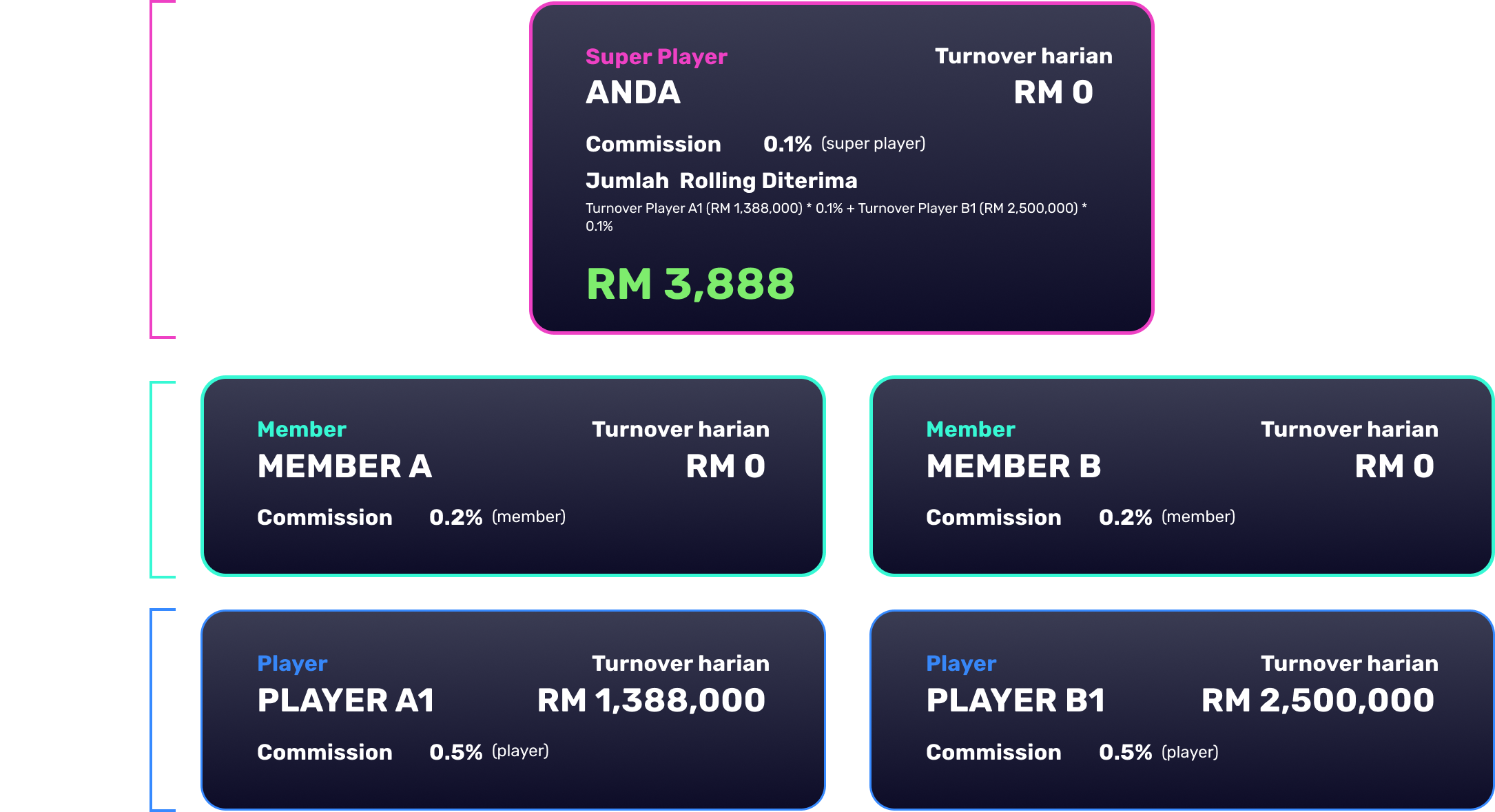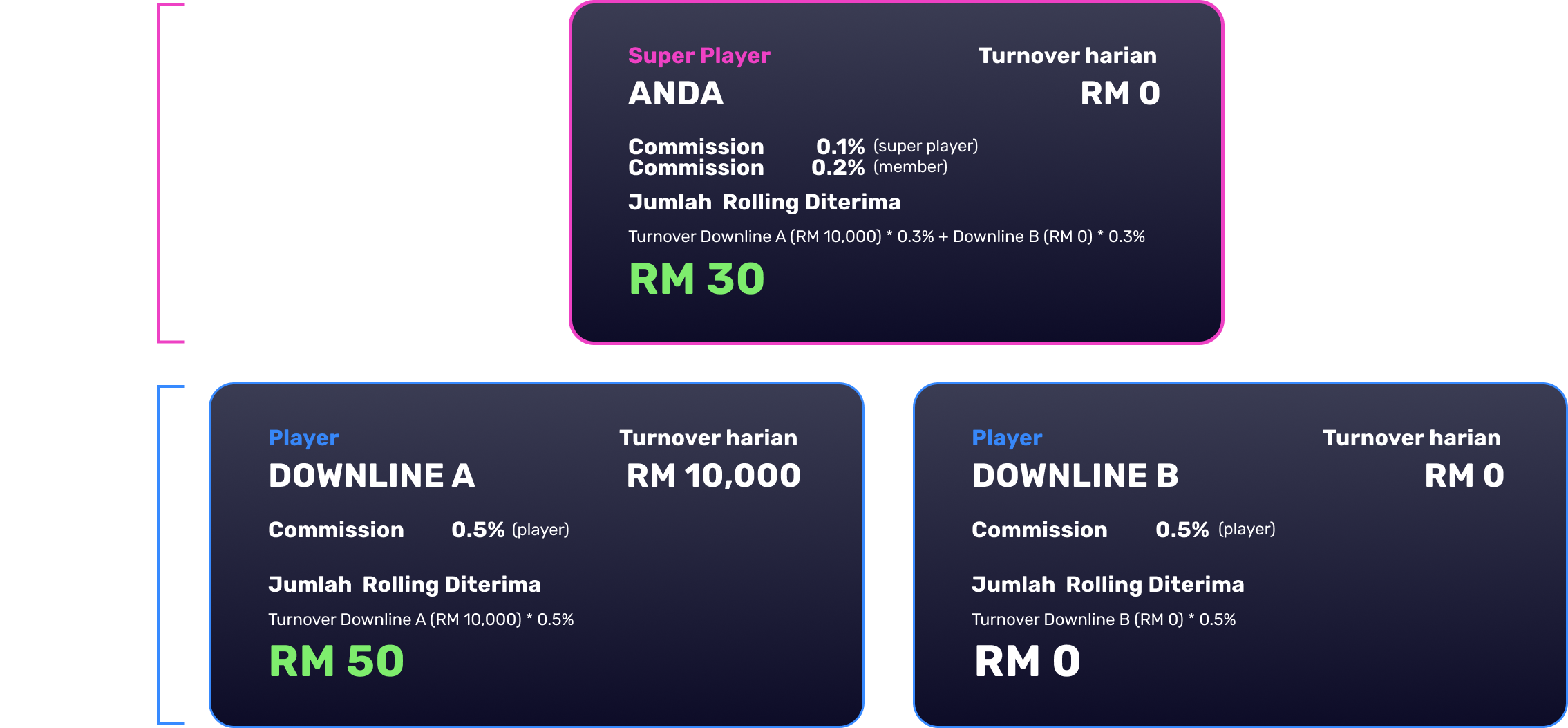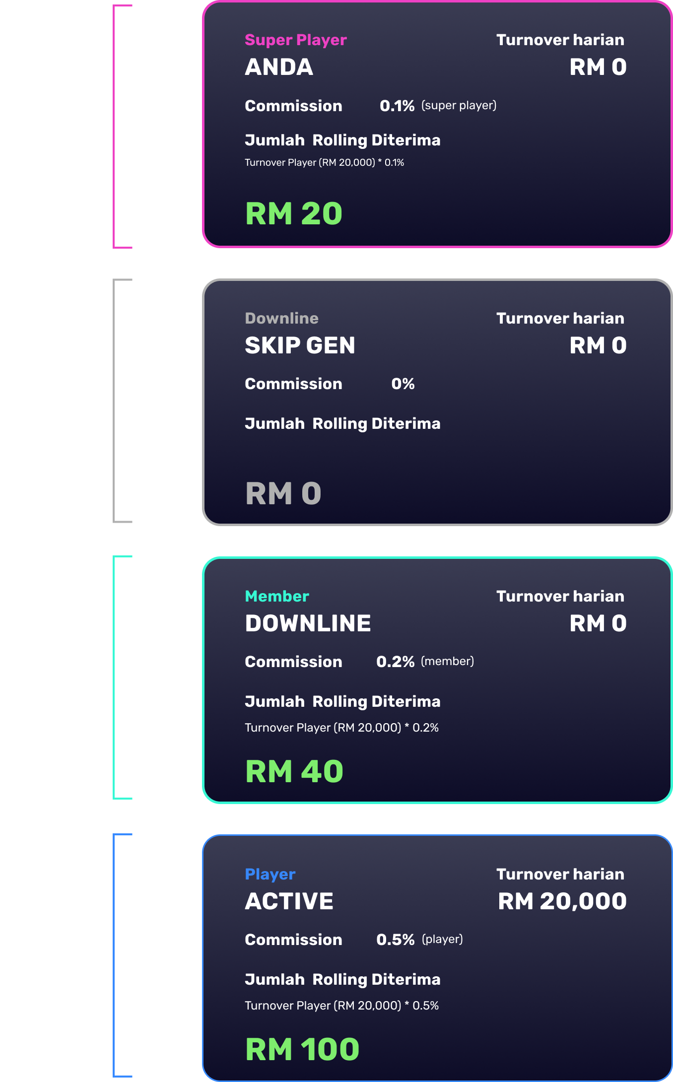 Anda hanya akan menerima peratusan rolling tambahan sebagai 'super player' daripada downline yang AKTIF sahaja. Downline yang tidak mempunyai sebarang turnover tidak akan dikira.